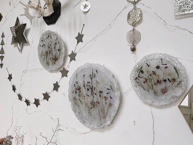 resin art ❉ flowers plate " forêt blanche " 柔らかいミルクのような色に包まれた植物のプレート テーブルなどに置くプレートやコースターとして、壁掛けや立て掛けて飾るオブジェとしてお使いいただけます 樹脂製ですが、コーティングしておりますので耐熱温度は100℃になります こちらのはサイズは3種類 s...約17.5㎝ こちらはSのページです m...約22㎝ l...約27㎝ 壁掛けとしてお使いいただく場合は、画像で使っているプレートハンガーもオプションでご購入いただけます。 プレートの大きさに合わせたものをご用意いたします。 オーダーの際に+900yen [プレートハンガー]を合わせてご購入下さいませ。 絵画のようなプレート 自然の可愛らしさ、繊細さ。 幻想的なジオラマ。 そんなイメージを小さな世界で表現できるよう製作していきたいです。 自然のものを閉じ込めて作るものからは季節を感じられ、その季節ごとに楽しんでいただけるのも魅力です。 素材:ドライフラワー,エポキシ樹脂,その他 空気に触れている状態より花材の持ちは良いですが、ドライフラワーやドライフルーツの状態は永続的に保たれるものではなく、ゆっくりと色褪せや劣化は起こります。 ※殆ど変化のない花材もございます。 それぞれInstagramでも作品の詳細を載せているのでよかったら見てください✩⡱ https://www.instagram.com/rendez_vous_log/ #レジン #レジンプレート #レジンアート #壁掛けインテリア #テーブル #コースター #レジンコースター #テーブルアクセサリー #テーブルプレート #インテリアフラワー #ドライフラワーインテリア #フラワーアクセサリー #ナプキンリング #テーブルデコレーション #アートプレート #トレイ #テーブルトレイ #キッチントレイ